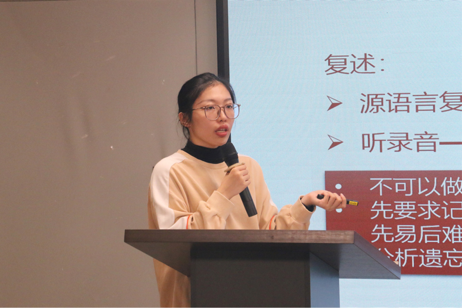交流会上,范梓淇老师围绕考试题型、备考策略、口译技巧三大方面进行讲解。她详细分析了口译综合能力和口译实务部分的考试要求,并结合历年真题为同学们拆解答题技巧。她强调,口译考试不仅考查语言能力,更需要考生具备良好的短时记忆能力、逻辑思维能力和信息提取能力,建议同学们在日常学习中有意识地进行翻译训练,并积累专业词汇。范梓淇老师还结合实际案例,展示了如何在口译过程中有效应对复杂句型,帮助同学们更直观地理解口译技巧。