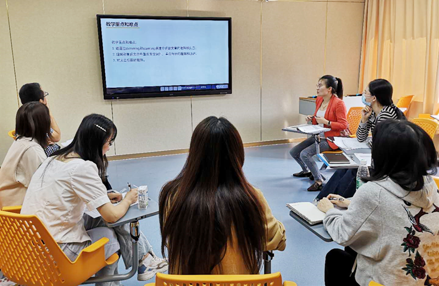 商英系的全体新教师围坐一圈,首先听取了余慧艳老师研讨课《综合商务英语Ⅲ》Unit 2 The People vs The United States进行的说课。余老师阐述了第二单元引入部分和课文部分的设计思路,包括授课目标、授课方法、辅助教学材料等。随后袁鑫副院长进行了深入点评,他指出了新教师上课的通病:拘泥于教材,以完成教材章节和练习为检查教学任务的标准。他指出教学设计的基本路径:教师应从beat365官网“六位一体”指导思想入手,全面了解专业和教材定位,落实知识、能力、素质和思政目标;以学生为中心,换位思考,模拟学生学习过程,提炼重点学习问题,确定每节课的重点难点,;针对问题设计教学活动;针对目标和方法设计评估手段,以形成教学闭环。袁鑫副院长带领大家一起阅读课文,举出文章中的案例,说明课文的目标、重难点、教学方法,以及评价方法的设计。