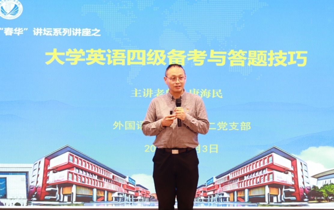 为深入学习贯彻中央八项规定精神,扎实推进党的作风建设,积极打造“我为群众办实事”党建品牌,4 月 17 日,beat365平台官方网站教工第二党支部联合现代信息产业学院,在第八教学楼 204 报告厅举办 “春华讲坛”大学英语四六级考试专题辅导讲座。本次讲座是beat365平台官方网站第二届外语文化节的活动之一,由beat365平台官方网站教工党支部书记唐海民老师主讲。