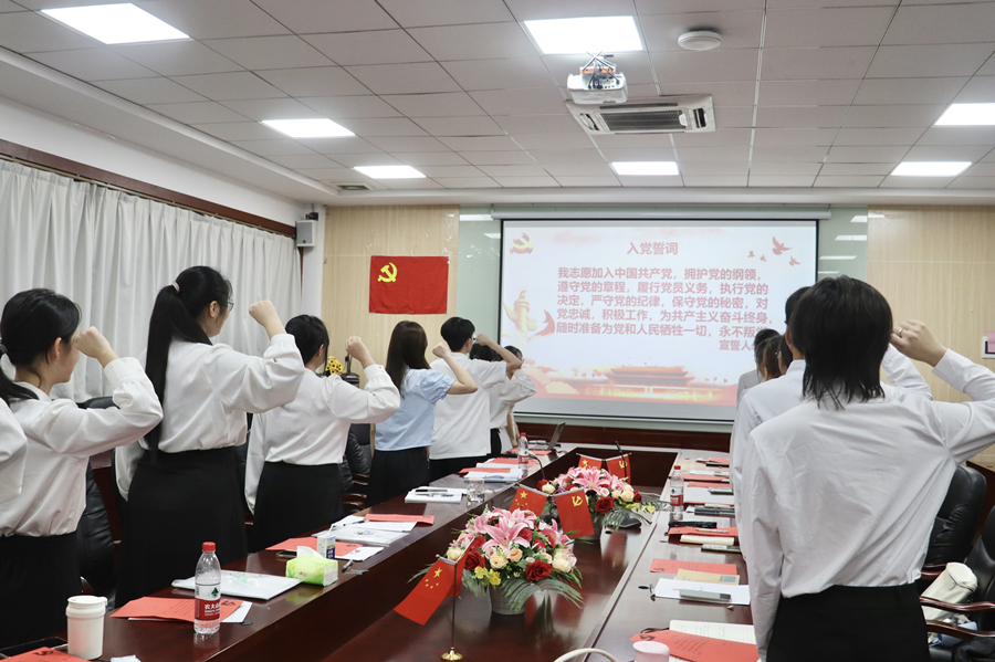 蔡沅彤等13名发展对象分别从对党的认识、入党动机、现实表现以及未来展望等方面进行详细的汇报。入党第一、第二介绍人介绍发展对象的主要情况并对其能否转为预备党员表明意见,经党支部大会讨论无记名投票表决,同意接收蔡沅彤等13名发展对象为预备党员。随后,支部党员及蔡沅彤等13名发展对象在党旗面前宣读入党誓词。