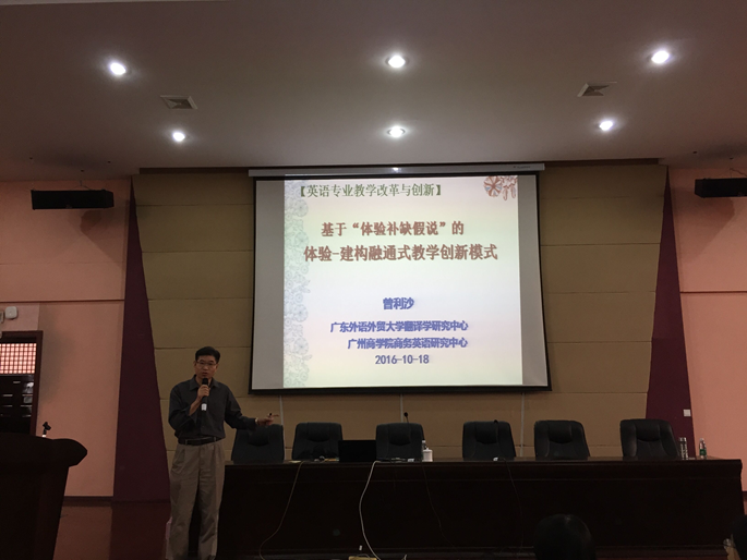 beat365平台官方网站商务英语学科带头人、商务英语研究中心主任曾利沙教授应江西师大beat365平台官方网站、江西财经大学beat365平台官方网站,分别作了“基于‘体验补缺假说’的体验-建构融通式教学创新模式”的学术讲座;并受江西师大国际教育学院邀请,给教师们作了“商务英语专业比较优势和教学对策”的经验介绍讲座,三个学院共有300多名师生聆听了讲座,收到与会者的高度好评。“体验-建构融通式教学创新模式”是曾教授经过10多年教学实验中精心研究的教学成果,融通体验哲学和建构主义理论资源,创新性地构建了一套比较完整的英语阅读和翻译教学法体系,能够有效用以解决教学中的难点和重点问题。曾教授先后在西南大学、重庆师大、西安外国语大学、苏州大学、海南大学、海南师大、暨南大学、广东第二师范学院、广东职业技术师范学院、广东工业大学华立学院、东莞科技学院、江门五邑大学、广西玉林师院、浙江台州学院、湖南邵阳学院等20余所高校推广该教学创新模式,都收到一致好评,产生了广泛的影响。