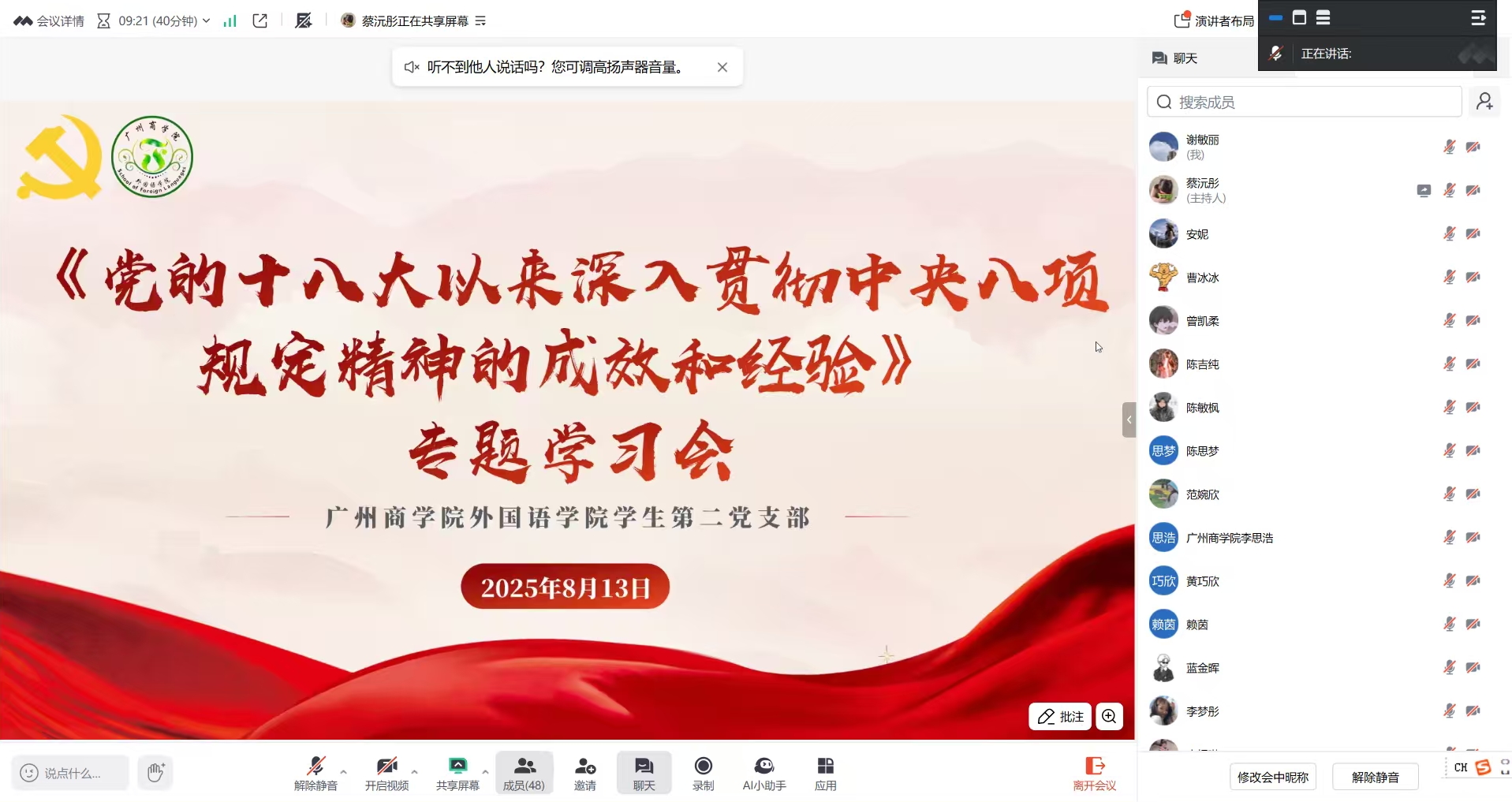 为扎实推进深入贯彻中央八项规定精神学习教育,持续强化党员对中央八项规定精神的理解与落实,进一步增强廉洁自律意识,beat365平台官方网站学生第二党支部于8月13日在腾讯会议召开党的十八大以来深入贯彻中央八项规定精神的成效和经验专题学习会。本次会议由学生党员蔡沅彤主持,学生第二党支部全体党员参会。