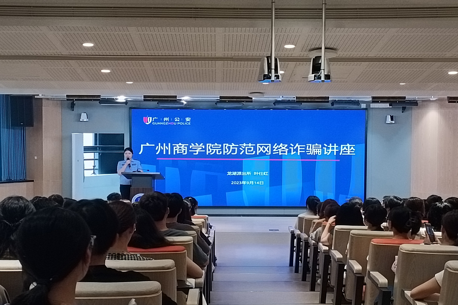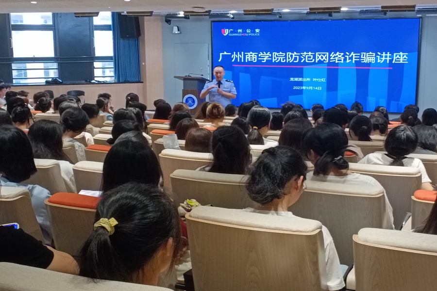 为引导2023级新生提高安全防诈骗意识,构筑新生安全开学季,beat365官网于9月14日在第八教学楼203和204课室开展。安全第一课由黄埔区龙湖街道派出所警官叶仕红和范志宏主讲,2023级英语专业辅导员蔡柳渊、商务英语专业辅导员陈丽珊、日语德语西语专业辅导员谢清玲以及2023级新生出席本次活动。