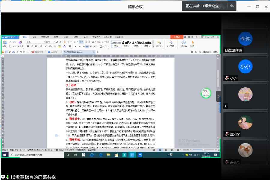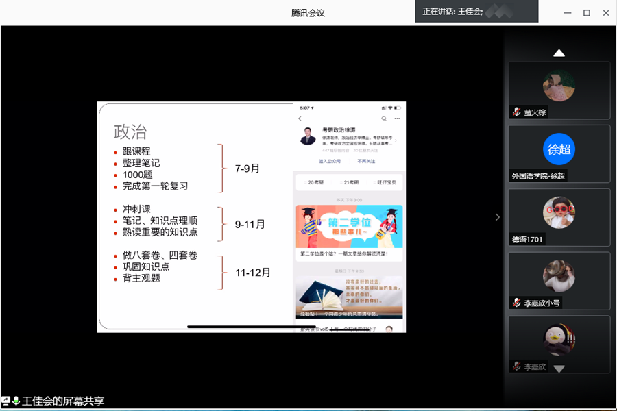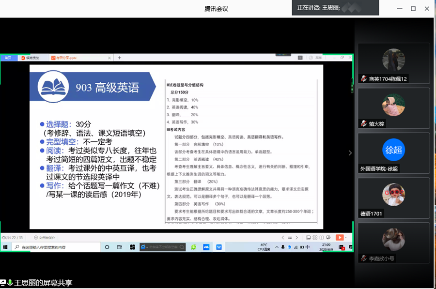 会前,主持人对参与本次分享会的分享嘉宾作了简要的介绍,然后由四位分享嘉宾分别进行经验分享。第一位分享的是16级英语专业的朱艺琳同学,她着重讲考研的前期准备,其中主要强调了择校的重要性,详细介绍了学科英语考试科目的题型和教材并就此分享了复习技巧。紧接着,16级英语专业王思丽同学讲述了广东技术师范大学的招生情况,公费定向培养模式,考研流程,各科教材购买注意点,还分享了复试科目的题型重点和面试形式。同样来自于16级英语专业的王佳会同学主要介绍了院校调剂问题以及各科不同阶段的复习计划。16级德语专业的黄晓宜同学主要分享了考取翻译硕士的经验并强调了学习真题的重要性。黄晓宜提到,只有先找真题进行分析,才能找准自己的备考方向。在这次线上会议中,同学们认真倾听各位师姐的考研经验和提分技巧,积极参与互动,踊跃提出自己的疑问,16级四位同学耐心解答,线上分享会的气氛十分活跃。