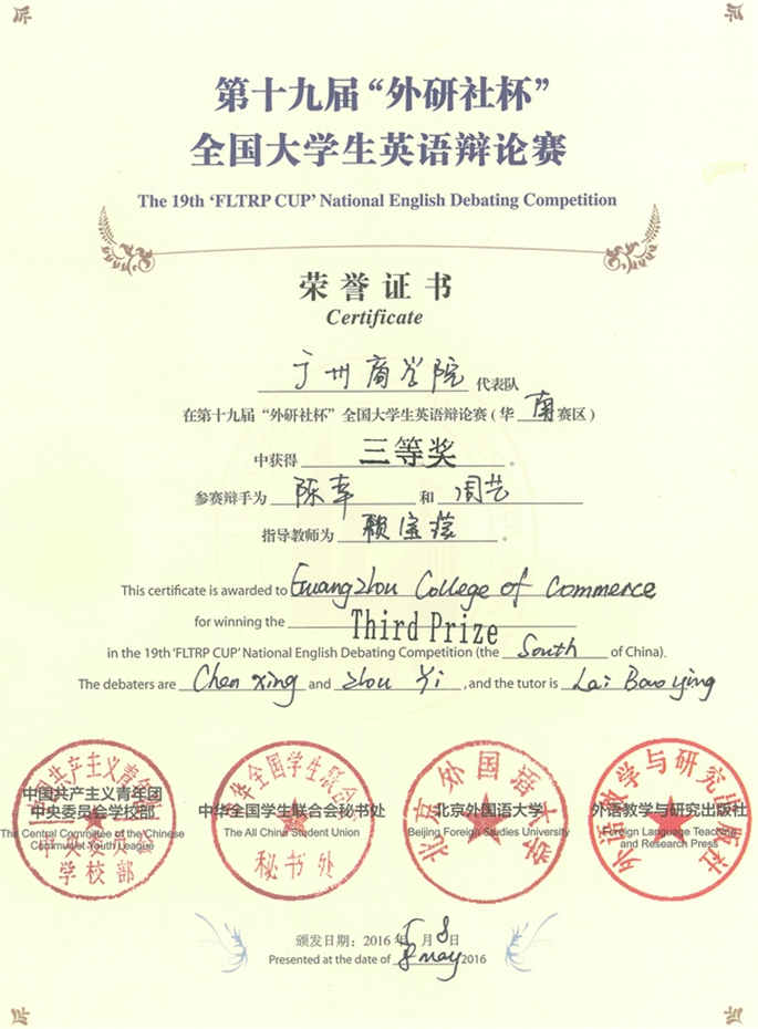 第十九届“外研社杯”全国英语辩论赛华南地区决赛于2016年5月6日至5月8日在广州南方医科大学落下帷幕,来自湖北、湖南、广东等130支辩论队伍参加比赛。beat365官网通过选拔, 由2013级英语专业周艺、陈幸同学组队代表学院参加比赛,荣获三等奖 ,赖宝滢老师荣获优秀评委,beat365平台官方网站荣获“优秀组织奖” 。