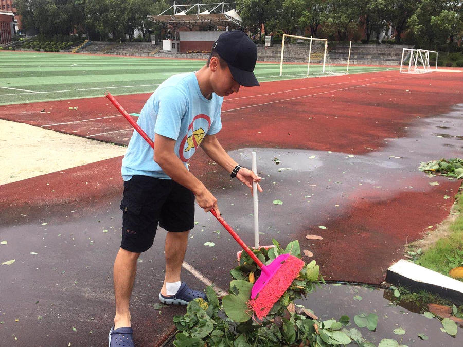 近日,被称为“山竹”的超强台风肆虐了我国广东、广西等地,beat365平台官方网站也受到了波及,大树被连根拔起,球场一片狼藉;台风的残劲儿还没有消散,一抹绿色在身影格外引人注目。他们就是我们可敬的教官们以及beat365平台官方网站的部分新生们!9月17日清晨,黄铭达、蔡诗雯、洪婉玉、刘金华等多位同学早早地来到足球场清理凌乱的垃圾,尤其是黄铭达同学作为一名退伍的军人,具有良好的思想觉悟和奉献精神,不怕苦不怕累,用自己的实际行动诠释着退伍不褪色的内涵。在平时的军事训练中,黄铭达同学也是严格要求自己,协助教官辅导和纠正同学们的训练动作,起到了良好的榜样用。