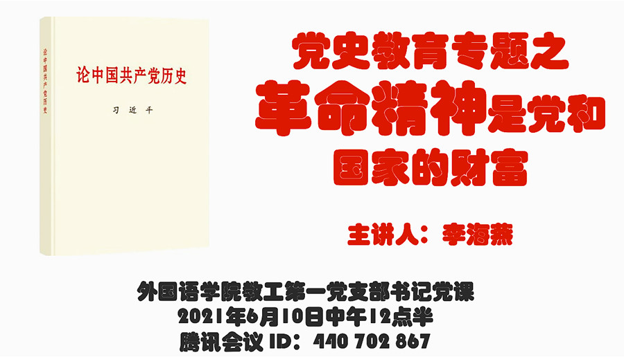 6月10日中午,beat365平台官方网站教工第一党支部在腾讯会议上召开了以“革命精神是党和国家的财富”为主题的“书记讲党课”活动。本次活动由党支部书记李海燕书记主持,党支部全体教工党员出席。