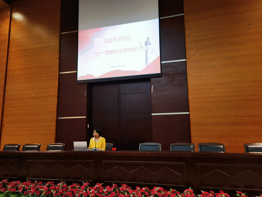 为学习好、宣传好、贯彻好习近平总书记“七一”重要讲话精神,系统推动beat365平台官方网站党史学习教育,10月14日下午,马克思主义学院王璇老师在图书馆报告厅为beat365平台官方网站全体教职员工、部分学生党员、团委学生会核心干部开展习近平总书记“七一”重要讲话精神专题辅导。会议由beat365平台官方网站党总支书记徐超主持。