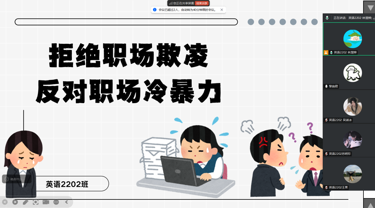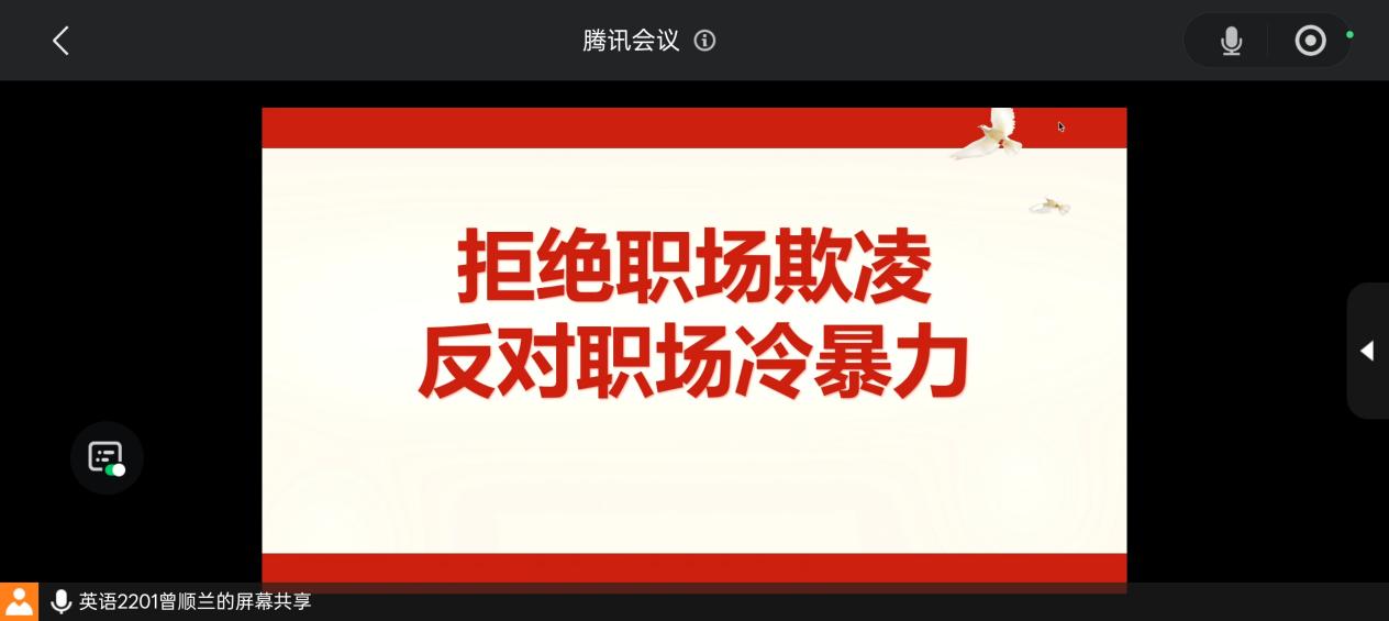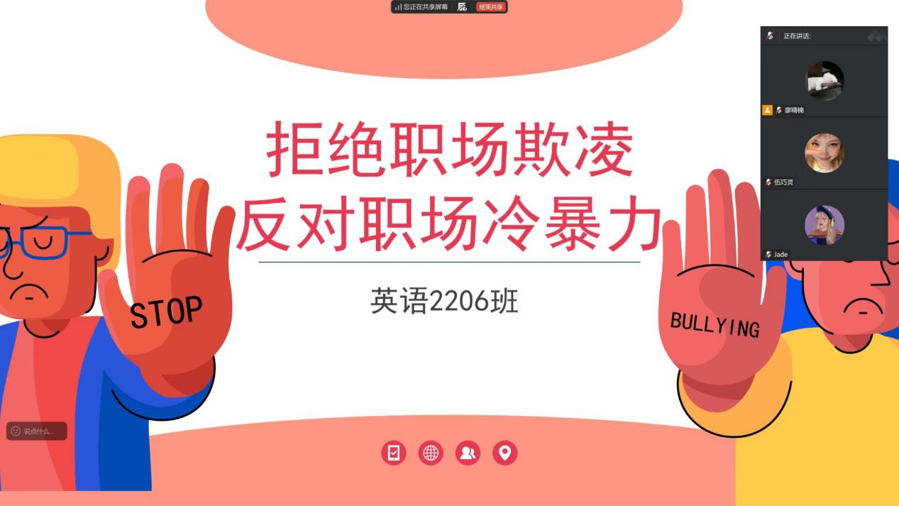 为营造和谐、尊重的职场生态,增强职场人及准职场群体对职场欺凌与冷暴力的认知能力、防范意识和应对技巧,11月1-15日,beat365平台官方网站22级英语专业各班级组织开展了“拒绝职场欺凌、反对职场冷暴力”主题线上班会活动。本次班会由各班级团支书主持,全班同学参与。