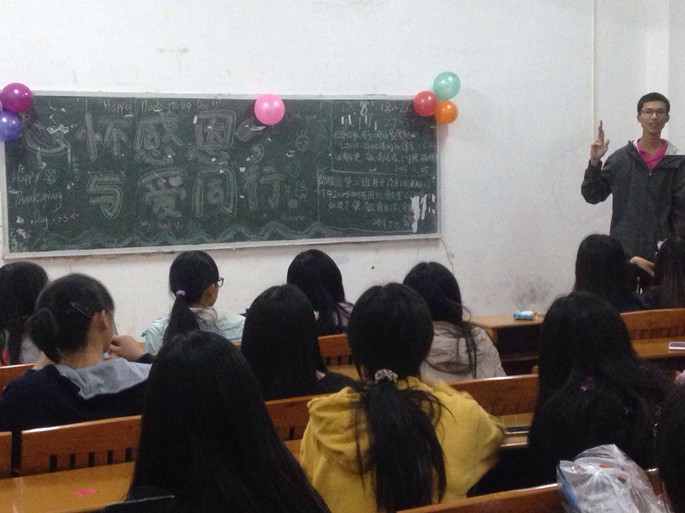 为了让同学们学会用实际行动去践行感恩,外语系15级英语2班于2015年11月26日感恩节这天在C202教室迎来了第二次班会活动。