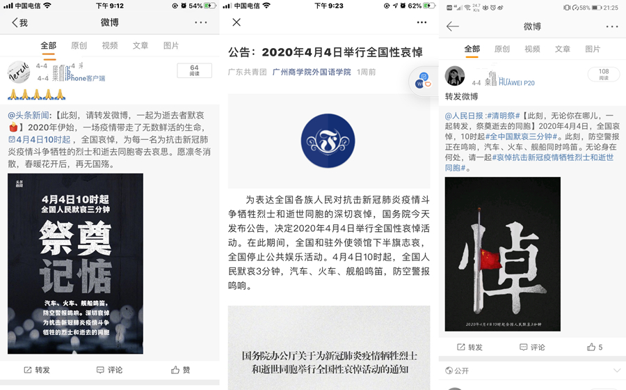 为表达全国各族人民对抗击新冠肺炎疫情斗争牺牲烈士和逝世同胞的深切哀悼,国务院发布公告,决定2020年4月4日举行全国性哀悼活动。在此期间,全国和驻外使领馆下半旗志哀,全国停止公共娱乐活动。4月4日10时起,全国人民默哀3分钟,汽车、火车、舰船鸣笛,防空警报鸣响。