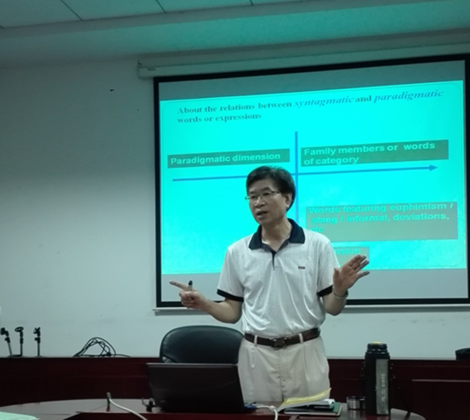本次沙龙的主要方向为综合英语阅读课程词汇教学方法创新研究,主要分为两个方面:一是语词概念习得的横组合与纵聚合关系(syntagmatic & paradigmatic relations),这是教学与科研紧密结合的途径之一;二是基于认知体验观的词汇教学方法。曾教授提出了综合阅读课词汇教学方法创新原则——四易准则,即易学、易记、易用、易辨析。综合阅读课词汇教学方法研究目标——促说、促听、促写、促译。最后是词汇教学方法,包括生活情景体验化、概念图式化、集束模块化、图片动漫视频多模态化、仿拟或角色化、定性分类概括化、认知规律经验总结化等。