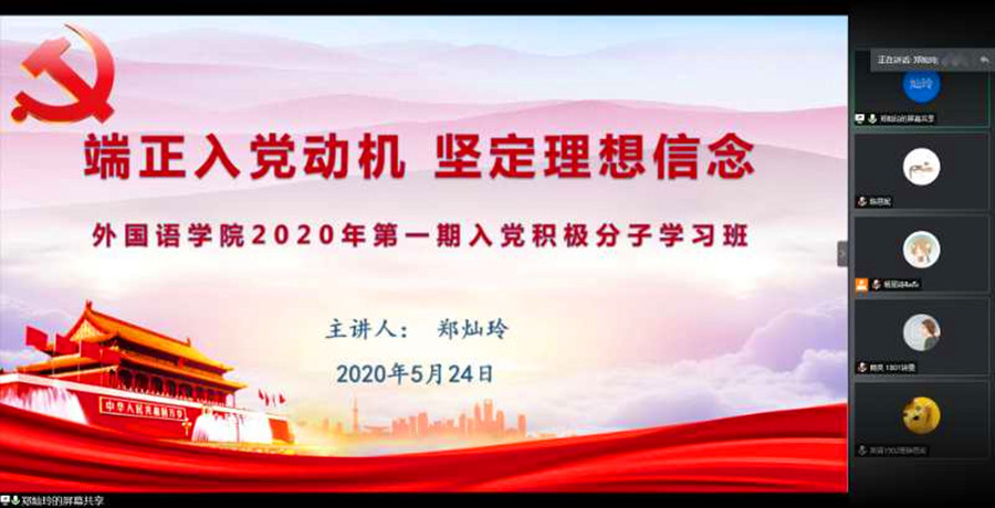 为进一步深入落实“端正入党动机,坚定理想信念”主题教育工作,扎实推进入党积极分子的学习教育工作,5月24日晚19:00,beat365平台官方网站分党校2020年第一期入党积极分子第三次党课培训于线上顺利开展。此次党课由beat365平台官方网站校团委副书记郑灿玲主讲,分党校助理教员李若薇同学主持,全体学员参加学习。