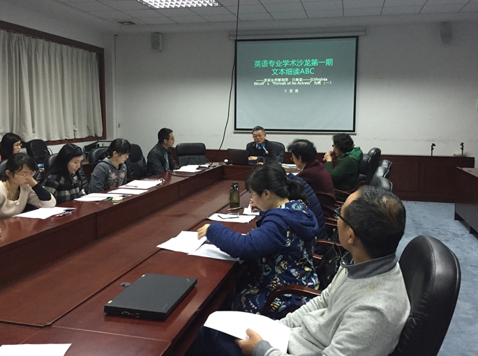作为活动的开场白,袁鑫副主任首先介绍了英语专业学术沙龙的宗旨和目标。王友贵教授的讲座分为两个部分:第一部分,王教授向老师们介绍了“文本细读”方法的缘起、目的以及基本步骤与技术;第二部分,通过带领大家一起按照文本细读的步骤阅读伍尔夫的
