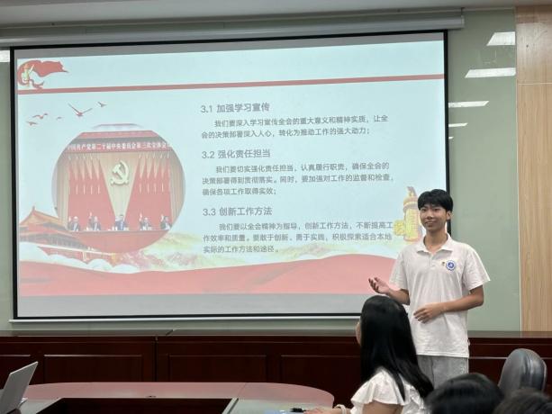 活动开场,学生会指导老师陈丽珊引领同学们回顾党的光辉发展历程,并深入学习习近平总书记关于党的建设的重要论述。陈丽珊着重强调,在新时代背景下,青年学生肩负着坚持党的领导、传承红色基因的重大责任与使命。同学们需将爱国精神切实落实到实际行动中,积极为党的事业添砖加瓦。在交流讨论环节,同学们热情高涨,纷纷踊跃发言,分享自身对党的理解与感悟。大家结合自己在学习、生活中的经历,讲述践行党的宗旨和精神的具体行动,抒发对党的忠诚与热爱,表达出为实现中华民族伟大复兴的中国梦而拼搏奋斗的坚定决心。现场气氛热烈非凡,讨论声与掌声交织不断。