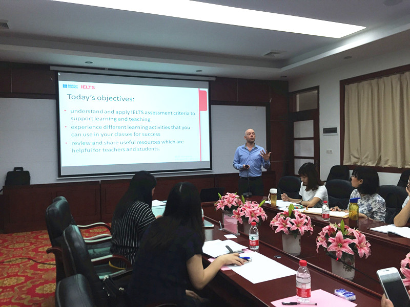 授牌仪式结束之后,雅思教师培训正式开始。英国培训专家Mark O’Sullivan首先简单介绍了雅思考试和中国学生在雅思考试中的短板,然后对与会英语教师进行了有针对性的雅思教学培训。整个培训内容充实,培训专家授课风格幽默。经过一天的培训,教师们对雅思考试和评分标准有了进一步了解,在有效组织课堂活动方面提高了业务水平。经过强化训练,每位教师均获得雅思培训教师的资格证书。期间,校长助理张忠福现场察看了教师们的学习培训情况,并参与到分组教学活动中去。马蔚兰院长也与该协会负责人进行了教学改革理念的沟通。
