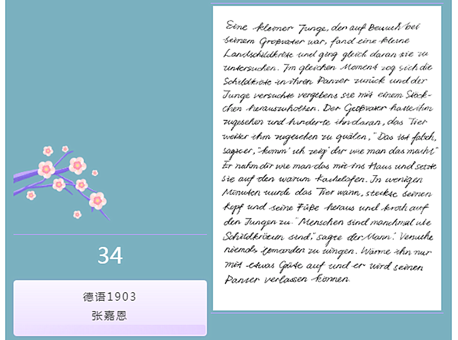 赛后,德语协会的指导老师章睿霖在这次比赛的评语总结中也说道:好的书写是外语学习的一个良好开端,可以端正学习的态度,从同学们的作品可以看出大家认真对待的态度。只要坚持多看多练多感受,一定可以写好一手漂亮的字。而对于德语的书写,老师也提出了一些建议:大家未来想要练习某些花式写法时,先明确好一种字体作为学习目标。学习时要从这种字体的笔画书写顺序开始学习。其次可以使用字帖临摹,注意字母的倾斜度和饱满度,寻找每个字母和单词之间的横向间距。最后可以使用四线格练习,寻找字母纵向高度之间的差别。