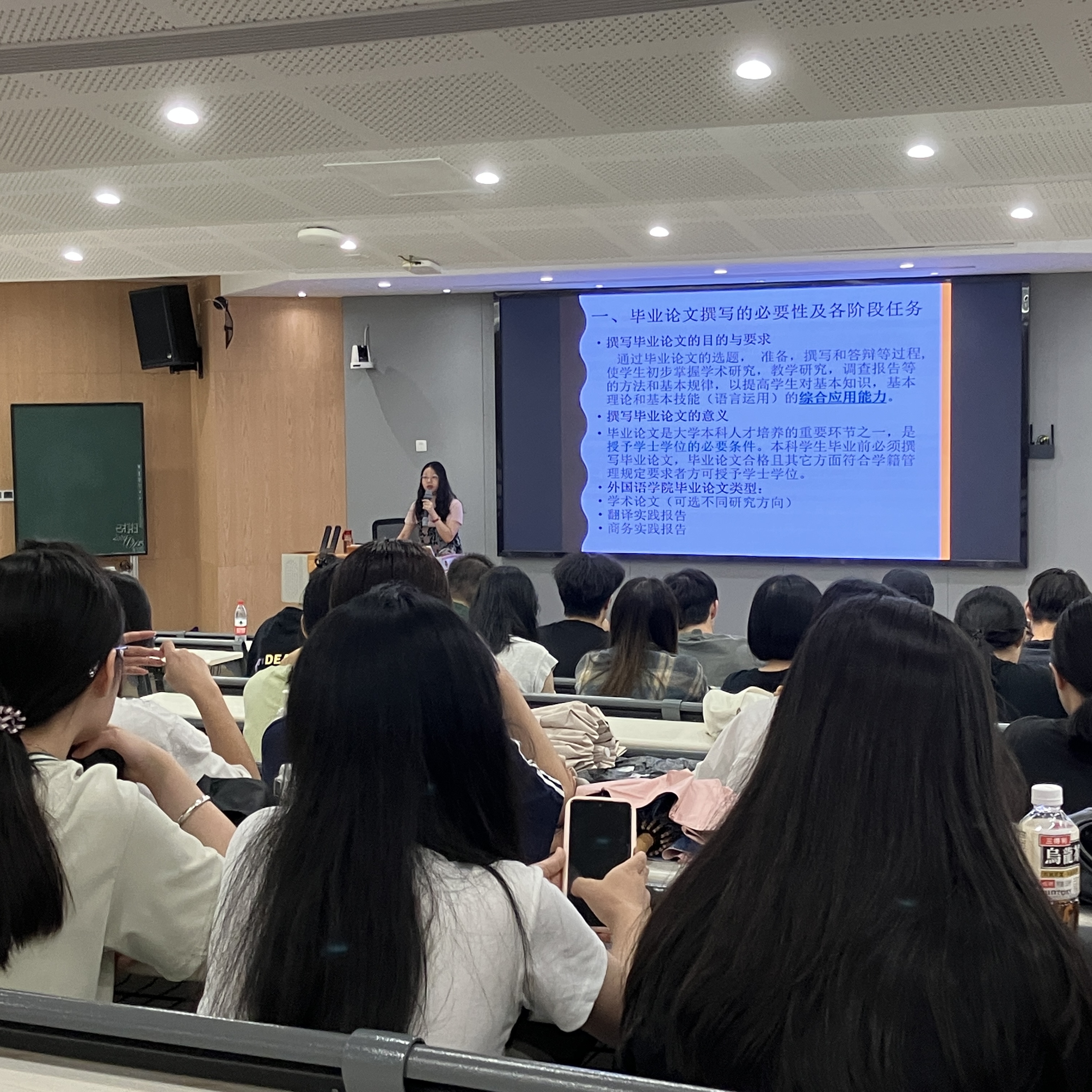 9月26日,为了更全面地覆盖即将步入毕业论文撰写与毕业实习阶段的毕业生,特别是考虑到部分同学已在校外进行实习,beat365官网在教学楼八教103创新性地采取了现场与线上直播相结合的方式,成功举办了2025届毕业论文毕业实习动员大会。此次会议不仅确保了留校学生能够直接参与、实时互动,也让校外实习的同学们能够跨越地域限制,同步获取重要信息与指导。会议由beat365平台官方网站副院长袁鑫、商务英语系主任李望华、英语专业系主任程瑜瑜、德语专业系主任周昳旸以及教务员杨超参加会议,各会议专场由各系主任主持。
