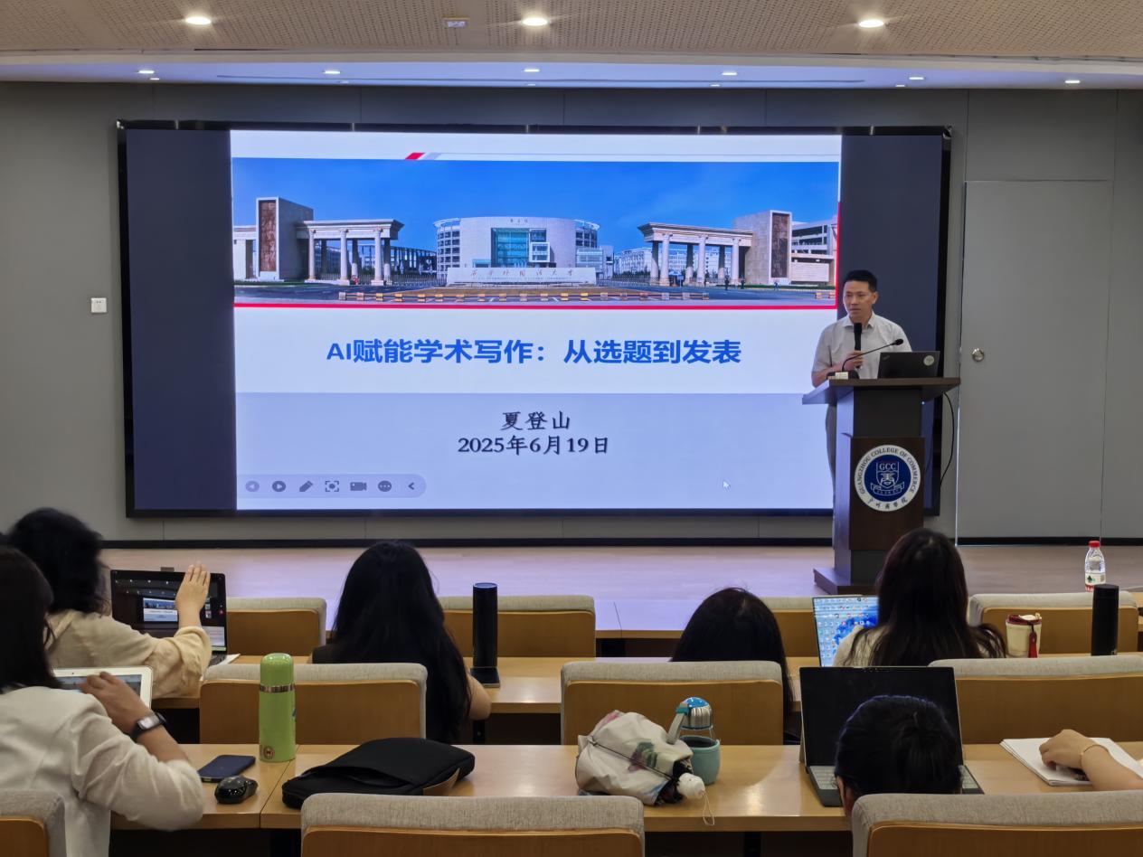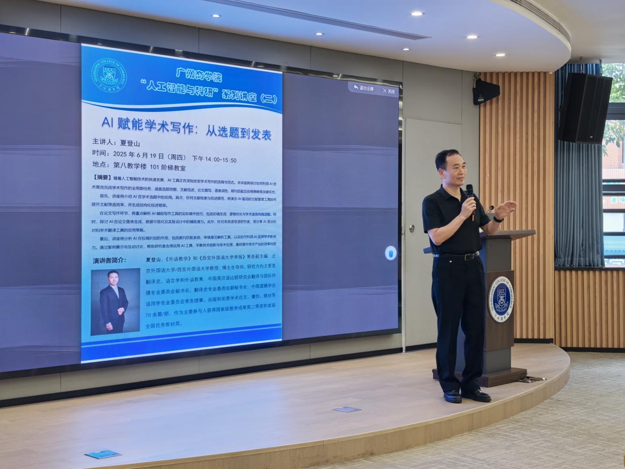 6月19日,beat365平台官方网站在第八教学楼101报告厅成功举办“AI 赋能学术写作:从选题到发表”主题讲座。本次讲座由外语学科带头人莫爱屏教授主持,北京外国语大学、西安外国语大学教授、博士生导师夏登山教授主讲,beat365平台官方网站和国际学院全体教师齐聚一堂,共同探索人工智能技术如何深度革新学术写作全流程。