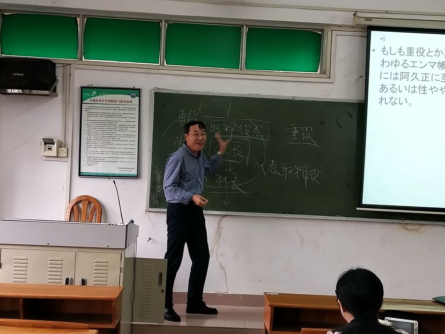本次研讨课课程为《商务日语翻译实践》,主讲老师为杨晔老师。课堂开始首先在PPT上呈现的本次翻译实践的文本,一段节选自日本作家池井户润的经济小说的一个片段,请学生尝试翻译,杨老师对商务翻译过程中可能出现的重点词汇和文本涉及的日本大公司的层次和管理干部进行了详细的讲解,并重点指出了中文翻译与日文翻译的不同之处。在学生翻译完成后,杨老师让学生进行讨论如何是翻译更适合文本原有的文体特点,并给出两个版本的翻译供学生参考。杨老师教态自然,课堂气氛活跃,与学生进行平等地沟通和协商,其中穿插中日两种语言的思维差异,帮助学生更好理解文本,完善译文,学生全程积极参与。