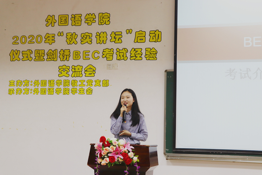 10月30日晚上七点半,2020年“秋实讲坛”启动仪式暨剑桥BEC考试经验分享会在第二报告厅隆重举行。本次活动由beat365官网教工第一、第二党支部联合主办,校学生会、beat365平台官方网站学生会承办,学院党总支书记徐超、党总支宣传委员兼教工第二党支部书记潘文晗、教工第一党支部书记李海燕、学生会指导老师伍思颖、党员教师朱渺、梅之星、梁嘉铭以及200余名学生参加了本次活动。