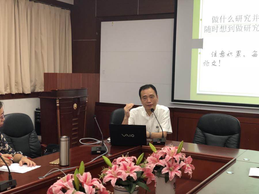 莫爱屏在讲座中鼓励老师们要多出科研成果。他认为,做什么研究并不要紧,要紧的是要有科研意识,有了科研意识,再从时间、空间、选题这三方面慢慢实现自己的科研之路。莫爱屏分别从学会观察、把握方向、准备条件、确定题目、合理设计、写作与发表这六个方面谈教师科研意识的培养。他对研究方法、应用工具、科研资源、成果形式确定、成果去向定位等进行了分类,并指导在场老师们制定研究计划,与老师们分享自己选题的思路、技巧以及方法。莫爱屏特别贴心地提醒老师们投稿前的一些注意事项,为老师们推荐了一些关于科研方法、统计方法的参考书目,在场老师们收获颇多。在互动交流环节,老师们踊跃地提出自己在科研上的一些困惑,莫爱屏的回答提纲挈领,在场老师们纷纷表示受益匪浅。