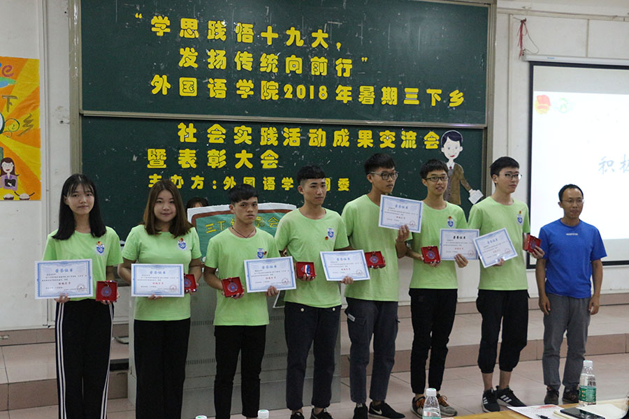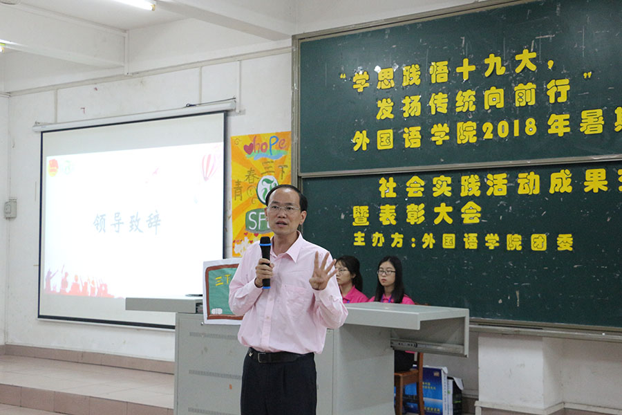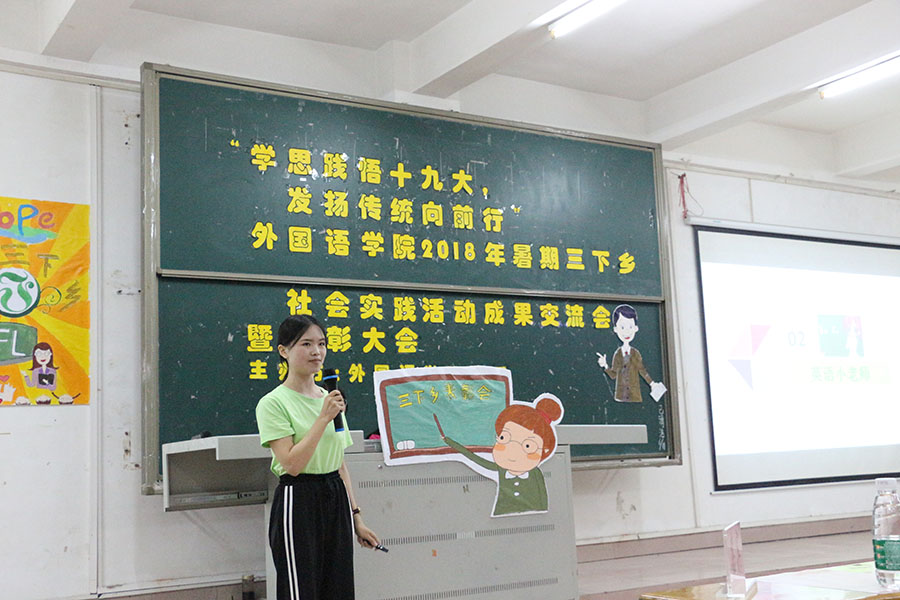 活动伊始,一段简短的视频拉开了本次暑期三下乡社会实践活动的序幕。接着实践调研部部长温诗雯、副部长严彤彤分别从传承文化、爱国教育、支教传爱、关爱下乡、实践调研、文艺汇演等六个方面介绍了此次活动的前期准备工作及具体实施情况。随后,刘万里老师宣读了表彰决定,对李然、钟可歆、欧青霞、杨俊娜等48名队员分别授予最美小老师、最美志愿者、积极分子、先进个人等荣誉称号。同时,优秀队员代表陈洁颖讲述了自己为期七天的英语班主任教学经历及教学成果展示。林松同学分享了深入基层进行实践调研活动的经历与收获。