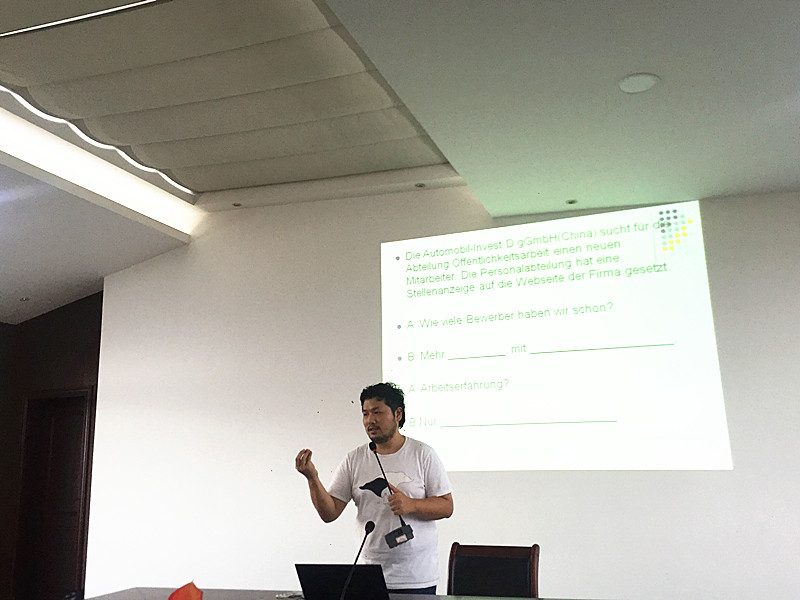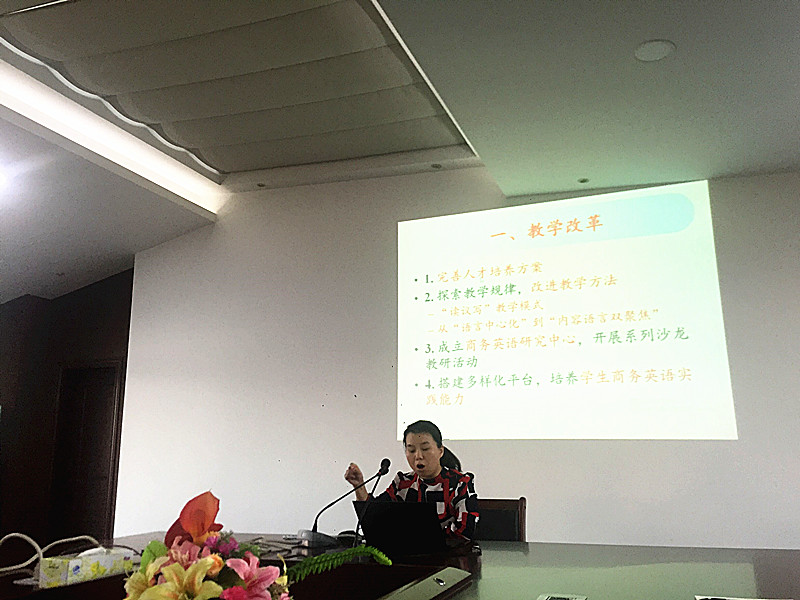 德语系的邓光远老师提出“以演促学”的新方法,让学生在自觉和不自觉的表演中习得外语,同时通过开展创意听写等活动提高学生的学习兴趣。日语系的罗玉玲老师采用了“以译促学”的新模式,让学生从大一开始有计划第进行翻译练习,提高自己的语言运用能力。大学英语教研室的李卓华老师则是在专门用途英语教学方面介绍了自己的经验,并提出了教师发展的新思路与新方向。基础英语教研室的张首翔老师介绍了如何利用认知语言学研究成果提高教学效果的尝试。随后伍彩芬老师为大家介绍了商务英语教学与科研相结合的经验,为老师们的长远发展提供了新途径。最后王秋瑶老师从学生的提问“讲课文有用吗”开始,以目标和兴趣为导向,改革了课文教学方法和词汇教学方法,取得良好效果。