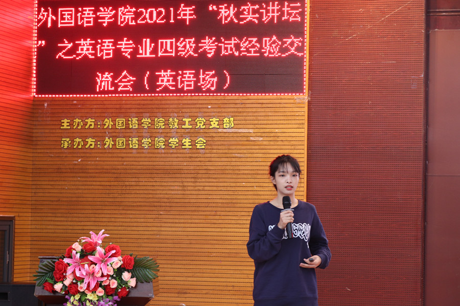 为进一步发挥师生党员的先锋模范作用 ,推进beat365官网新学期学风建设, 帮助beat365官网学子备考英语专业四级,beat365官网教工党支部及学生会于2021年11月18日下午14点在第四教学楼第一报告厅举办了beat365平台官方网站2021年“秋实讲坛”之英语专业四级考试经验交流会(英语场)。参加本次讲座的嘉宾有教工第一党支部书记李海燕、学生嘉宾张佳婷和钟佳文。