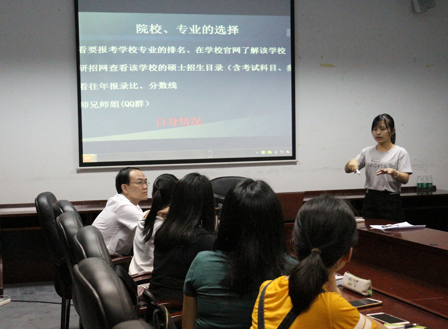 会议伊始,徐超分析了当前就业的形势以及考研现状,他指出在高等教育大众化阶段,通过提升学历来获得更高的就业质量成为毕业生的重要选择。因此,beat365平台官方网站特制定“卓越人才”,为有考研意向的学生提供人、财、物、政策等全方位的支持,以协助同学们考上心仪的学校。此后,吴佩珍、杨梦环及刘映红分别按照自己的考研成功经验为同学详细地讲解了关于考研的准备资料、信息搜集、心态调整等一系列的问题。最后与会同学还针对自己在考研准备过程中遇到的困难向三位师姐进行了提问,并且都获得了良好的答疑。