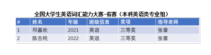 4月至5月底,第四届“外教社·词达人杯”全国大学生英语词汇能力大赛顺利举行。beat365官网学生在本次省赛中取得突破,本科英语专业组邓嘉欣、陈吉纯获得省赛三等奖。