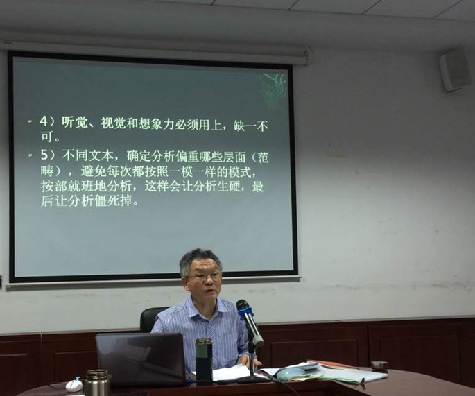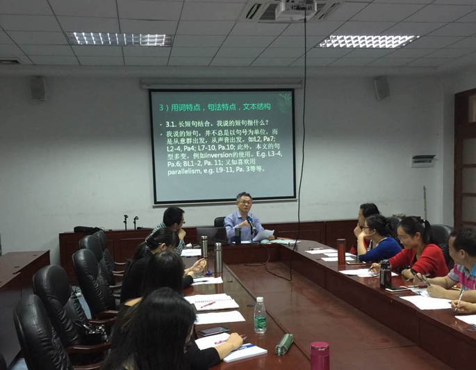 整个活动分为两个部分:第一部分,王教授接着上期的分析思路,重点分析了句长、修辞等文本要素,针对如何把文本分析做得更专业以及如何让文本阐释更客观两个问题结合Virginia Woolf’s ‘ Portrait of An Actress’里面的具体例子给老师具体演示。王教授指出在分析中要从不同的角度出发来看文本中的种种语言现象,尽可能猜测作者的写作意图,同时要注意文本的张力,在文本中寻找解读的线索,或“路牌”,才能使文本解读更加专业和客观。第二部分,在座的老师们就文本理解和文本细读的方法与王教授进行交流。