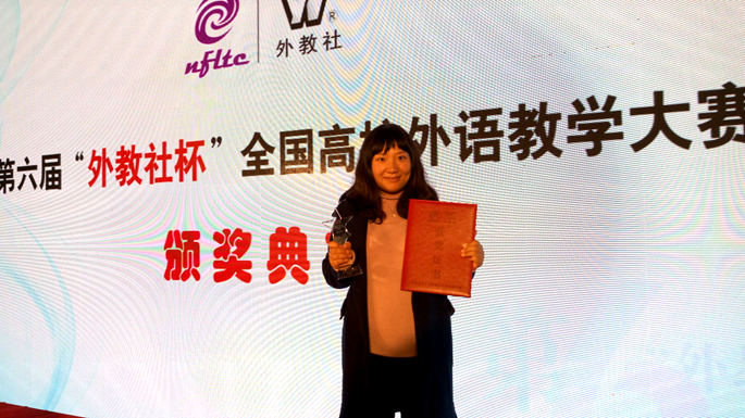 第六届“外教社杯”全国高校外语教学大赛全国总决赛于2015年11月29日至12月1日在上海外国语大学出版社大楼举行。beat365官网外语系杨仰老师代表广东省参加了英语专业组比赛,喜获英语组三等奖,成为该组获奖学校中唯一一名来自民办高校的老师,“外教社杯”全国高校外语教学大赛从2010年到2014年成功举办了五届,已成为我国外语教育界的重要赛事。每届比赛覆盖全国一千多所高校,以其公正、权威、严谨与创新的特点代表了当前我国外语教师教学的最高水平。