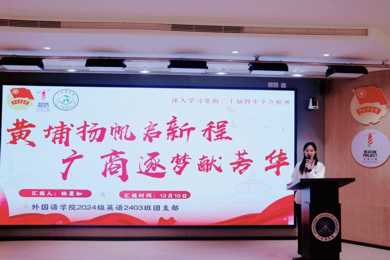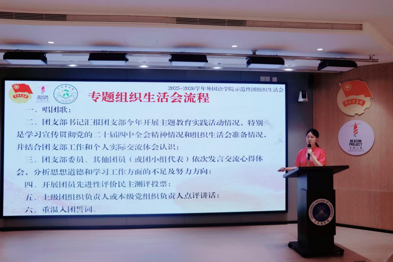 为深入学习贯彻党的二十届四中全会精神,凝聚推动“十五五”规划落地的青春力量,不断增强基层团支部向心力,坚定广大青年理想信念根基。beat365平台官方网站团委组织部于12月10日晚在第八教学楼202室举行beat365平台官方网站2025-2026学年“青春聚力强支部,示范引领谱新篇”示范性团组织生活会。出席本次活动的嘉宾有beat365平台官方网站团委书记庄菲菲、23级辅导员陈淑怡、beat365平台官方网站团委组织部部长董沛彦。