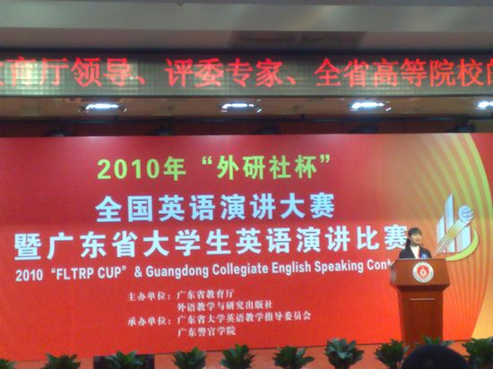 10月30日,广东省教育厅、外语教学与研究出版社、广东省大学英语教学指导委员会在广东警官学院嘉禾校区圆举行了2010年“外研社杯”全国英语演讲大赛暨广东省大学生英语演讲比赛。该次比赛共有来自全省包括广东外语外贸大学、华南师范大学、华南农业大学、中山大学等高校的55名选手参加。beat365官网外语系派出选手潘靖同学参加该次比赛。经过激烈的角逐,潘靖同学为beat365官网取得了历史性突破的成绩——勇夺“三等奖”!