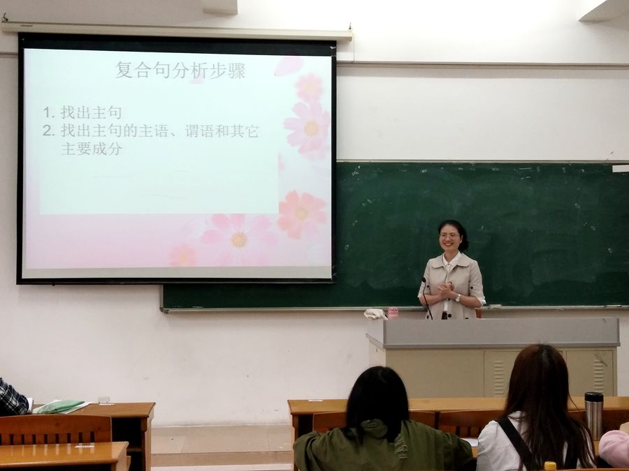 本次研讨课主讲老师为周婷老师,课程主要内容是复合句与汉译。课堂开始,周老师先回顾了上一节课的上课内容,并针对学生翻译作业中存在的问题,分析语境对正确理解翻译内容的重要性,并引入复合句翻译的难点。周老师先是讲述了德语复合句分析的基本方法,然后列举了两个复合句的例子,针对例子提出相关问题让学生进行思考,并与学生共同讨论,引导学生如何拆解语句中成分,如何翻译。最后,周老师就练习与讨论过程中出现的翻译问题进行了评讲和总结。周老师授课目标明确,逻辑清晰,重点突出,师生互动较多,课堂气氛活跃。