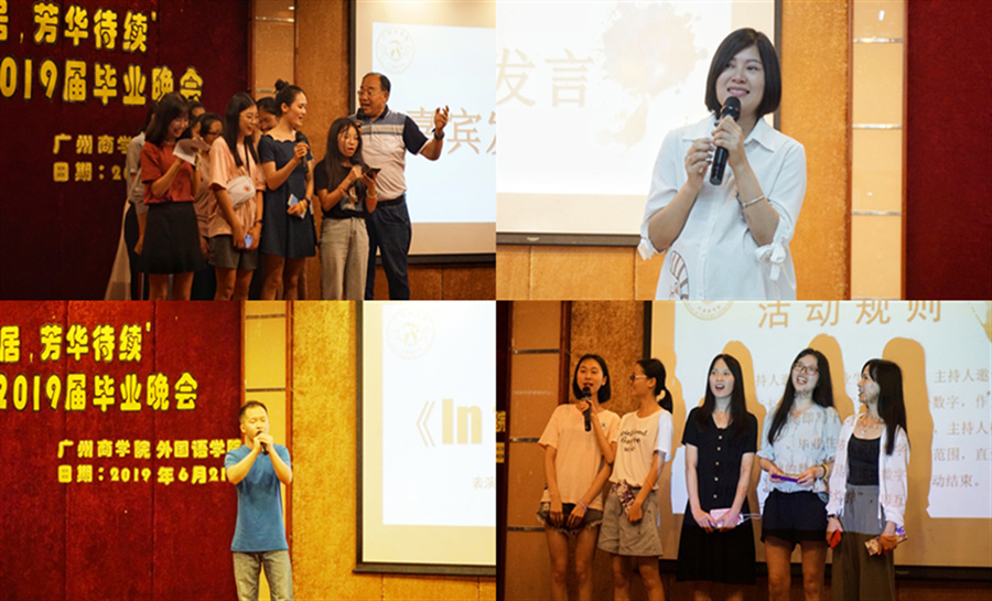在晚会伊始,一曲青春活泼的《Dalla Dalla》瞬间点燃了现场的气氛。接着通过幽默有趣的“广商新闻”播报回忆了毕业生们大学四年的酸甜苦辣。轻快的杯子舞紧随其后。曾庆强和郑海军同学为毕业生献唱了一曲激昂《In the end》,抒发了对时间飞逝的感慨。在互动环节,毕业生们也积极参与了游戏,气氛很是热烈。随后毕业生代表陈海英进行发言。她感叹时光飞逝,表达了对徐超书记、课任老师、辅导员等人的感谢,并表达了对全体毕业生们的祝福。晚会接近尾声,播放了一个令人暖心的视频,其中有充满回忆的照片,有各位领导老师、学弟学妹们和宿管阿姨等人的祝福,歌舞厅内时不时地响起阵阵掌声与笑声。