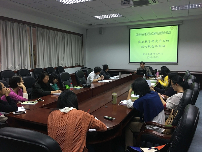 讲座一开始,曾教授对商务英语系伍彩芬老师在beat365官网“第3届中青年教师教学大赛”中获得第一名的好成绩予以充分的肯定,请伍彩芬老师用简短的语言对自己课程设计的思想进行总结,由此引入了今天沙龙的主题——英语教学研究论文的理论概念化表征,指导教师们如何把教学实践的经验上升为概念,形成自己的教学理论。