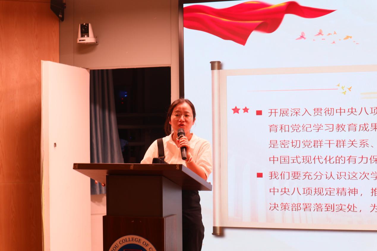蔡文蝶带领支部全体入党积极分子认真学习领会习近平总书记关于加强党的作风建设的重要论述,系统总结党的十八大以来深入贯彻中央八项规定精神学习教育取得的显著成效。同时,她指出,接过历史接力棒的新一代共产党人,从立规矩开始,从作风建设切入,从每一位共产党员做起,开启了再塑自身形象的“第一行动”接着她通过图文并茂的形式,严肃指出了违反中央八项规定精神的典型案例,详细阐述了党中央对违反中央八项规定精神行为的零容忍态度。她号召全体成员以“作风建设永远在路上”的韧劲,争做廉洁自律的表率。