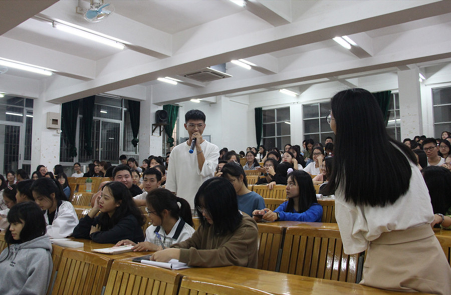 承接专题片中的关键词“初心”、“使命”,郑灿玲老师与在场干部进行互动:“担任学生干部的初心是什么?使命是什么?”她结合当前“守初心、找差距、担使命、抓落实”的总要求一一阐述,分享了自己的见解。她以“五个一”为标准向全体干部提出了要求,即“一颗心、一个头脑、一张嘴、一支笔、一双腿”,希望各位干部能提高政治站位,做好日常基础工作,学会统筹兼顾,及时总结反思,提升自身素质,发挥引领作用。随后,英语1701等班团干部代表就日常工作案例经验与在场干部展开交流,分享心得要点。