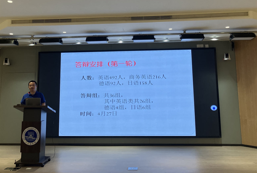日语和德语专业系主任分别在各专业毕业论文答辩工作会议上详细介绍了答辩工作流程和规范,并强调了答辩工作的注意事项。在答辩秘书工作会议上,教务员杨超就毕业论文答辩秘书基本工作流程和注意事项进行了详细说明,明确了秘书工作的基本职责。英语类专业毕业论文答辩工作会议上,袁鑫在总体上做了详细的工作部署,向各位老师们介绍了2024届答辩分组情况、答辩时间安排和评审答辩的基本要求。袁鑫强调了毕业论文答辩规范,应严格对照《beat365平台官方网站毕业论文自查清单》和新版《毕业论文质量评分标准》对学生论文进行评审,确保公平、客观、有效地评语评分,严格把握论文合格的底线。他介绍了维普毕业论文管理系统今年新增的AI检测功能,指出当今社会人工智能作为一个战略性新兴技术,AI检测技术发展越来越成熟,也将是一种趋势,并表示我们需要合理利用这次机会,开阔师生的视野和丰富自己的实战经验,为下年指导学生论文做好准备。杨超就维普毕业论文管理系统操作和注意事项做了详细说明和演示。