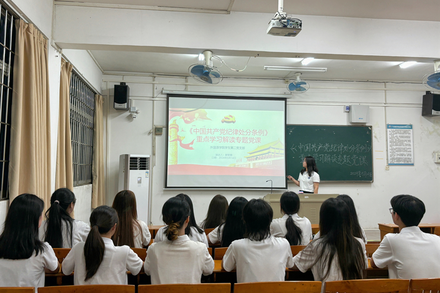 为深入贯彻习近平总书记关于党纪学习教育的重要指示精神,切实加强党支部的纪律建设,不断增强党支部成员学纪、知纪、明纪、守纪的纪律自觉。beat365平台官方网站学生第二党支部于5月14日20:00在第六教学楼305室开展《中国共产党纪律处分条例》重点学习解读专题党课,参与本次专题学习的有beat365平台官方网站学生第二党支部书记谢敏丽、22级英语专业辅导员陈钰洵、22级商务英语专业辅导员庄菲菲及党支部成员代表们。