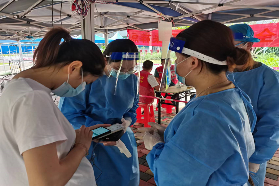 下午2:30分,beat365官网19级学生党支部的第一批志愿者到达社区,以最快速度做好防护措施,等待社区工作人员的工作分配。7名党员志愿者分成两组,一组志愿者被分配在核酸检测入口处,协助群众进行信息登记、流程指引、人员导流,维持秩序等工作,确保核酸检测场地内群众保持1米距离,进出口通畅,无交叉感染风险。另一组志愿者负责登录系统,耐心细致的扫码登记群众的核酸信息。天有不测风云,突如其来的强降雨为志愿者们的核酸检测工作增添了不少难度,全体党员不惧风雨,冲锋在前,始终与医护、现场工作人员并肩作战,全心全意为来采样的居民服务,以实际行动践行着“全心全意为人民服务”的宗旨。
