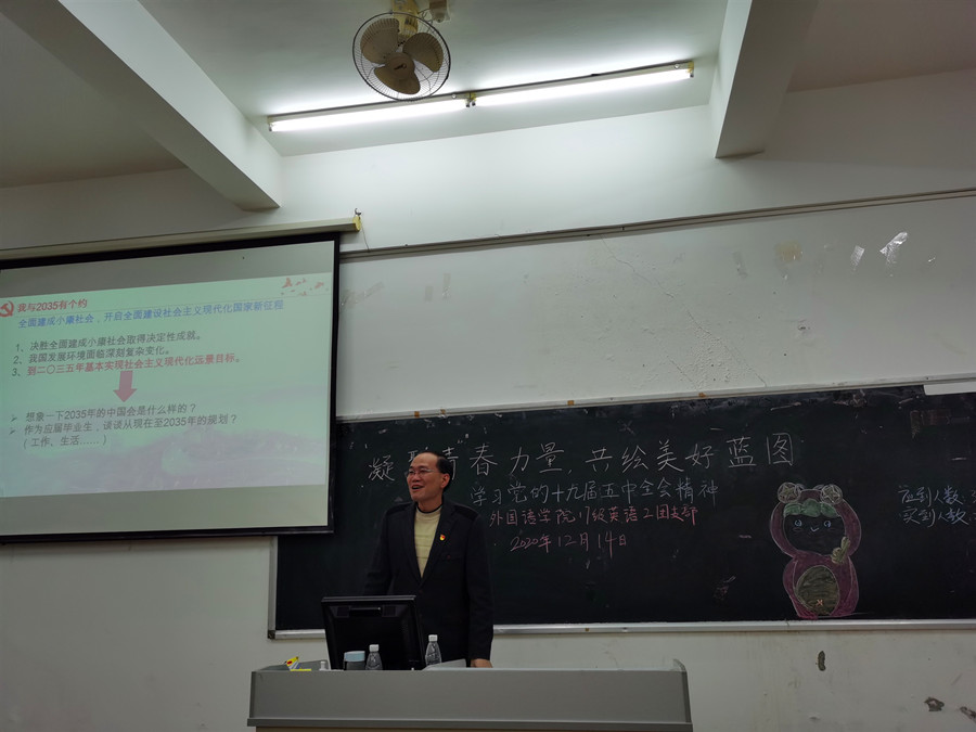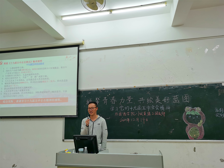 为全面贯彻党的十九届五中全会精神,深入理解党和国家事业取得的非凡成就,领悟习近平新时代中国特色社会主义思想的实践伟力,beat365平台官方网站17级英语2团支部于12月14日19时30分在四教110召开“学习党的十九届五中全会精神”主题团日活动,与会嘉宾有结对子老师黄弢校长、beat365平台官方网站党总支徐超书记及17级英语专业辅导员刘丽老师,活动由团支书林晓莉主持。