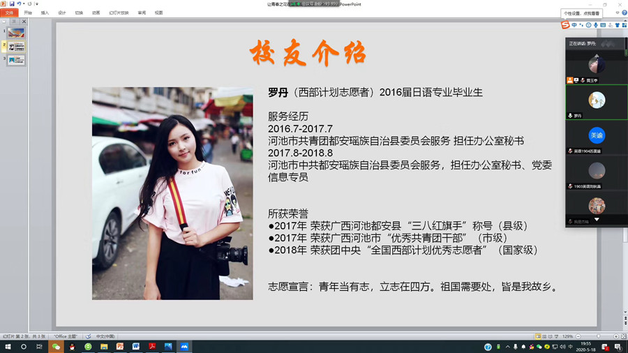 罗丹,2016年参加西部计划志愿者,先后在河池市共青团都安瑶族自治县委员会,河池市中共都安瑶族自治县委员会服务。罗丹在分享会上,倾情相授,从详细介绍了西部计划的各项政策、申报西部计划的要求和注意事项;特别分享了在服务期内的点点滴滴和难忘经历;吴意,2019届参加希望乡村教师计划,现在在梅州市兴宁市水西学校服务,目前承担三年级语文等科目教学工作,兼任班主任。吴意也详细分享了项目的申报、培训内容、服务经历,特别讲述了她与学生的故事,服务经历的期待、温暖和友爱,引起了师弟妹的种种好奇心。在互动环节,线上的交流群更是热闹,参与的同学积极发言提问,深入地了解了各个基层服务项目的日常工作和生活,困难和挑战。两位校友都一一解答。