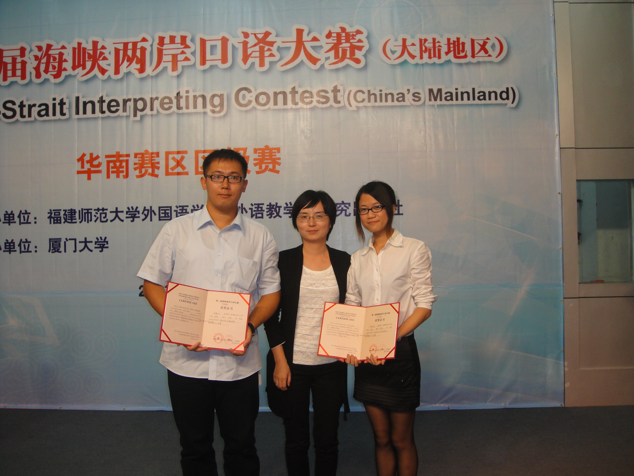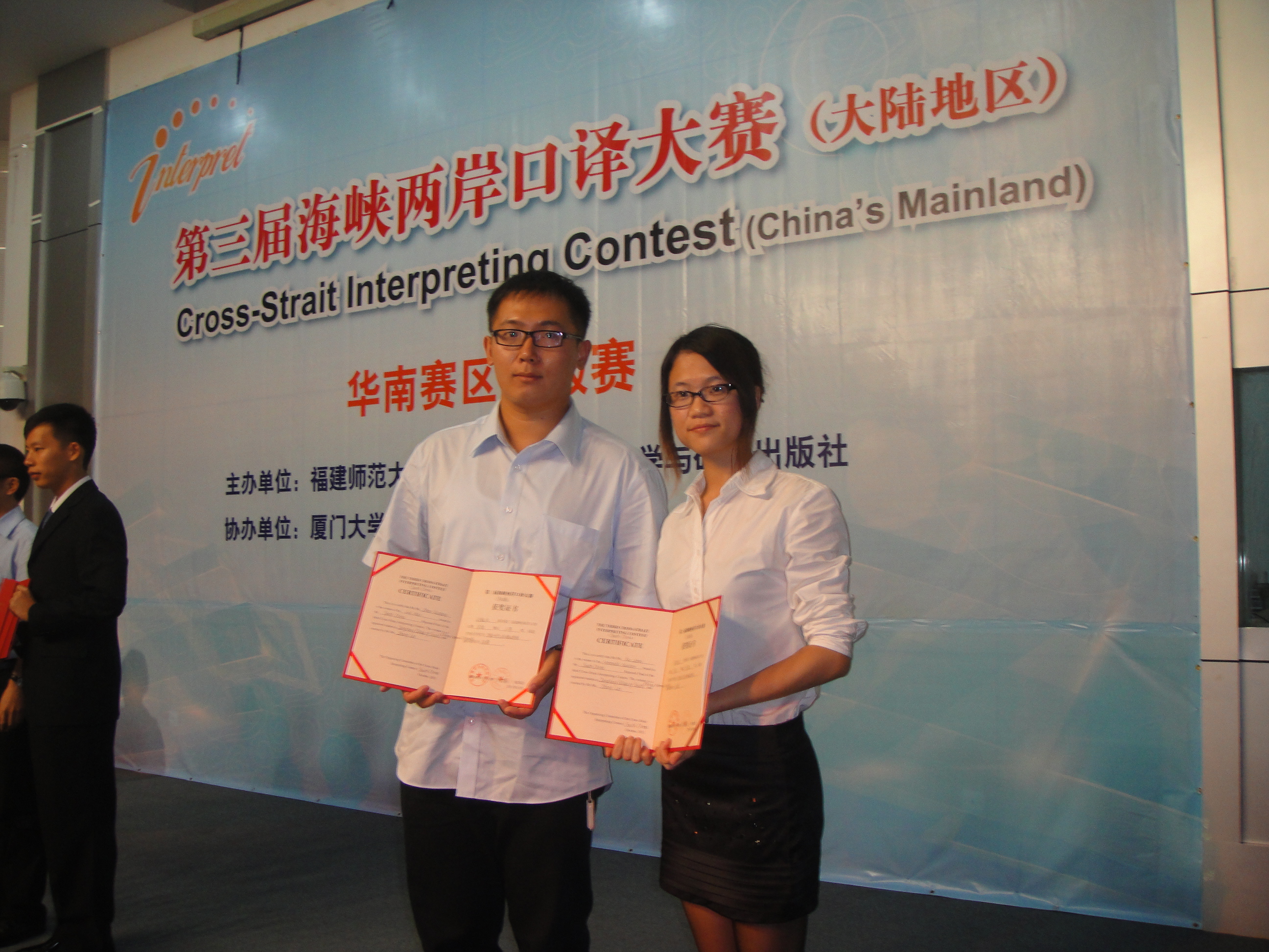 2011年10月15日,第三届海峡两岸口译大赛(华南赛区)在福建师范大学beat365平台官方网站成功举行。在学院、教学处领导的大力支持下,在张蕾老师的悉心指导下,beat365官网外语系08级英语专业(涉外翻译方向)本科生战睿沨、徐丽斌参加了比赛,并分别获得了该次比赛的三等奖和优胜奖(名次靠前)。