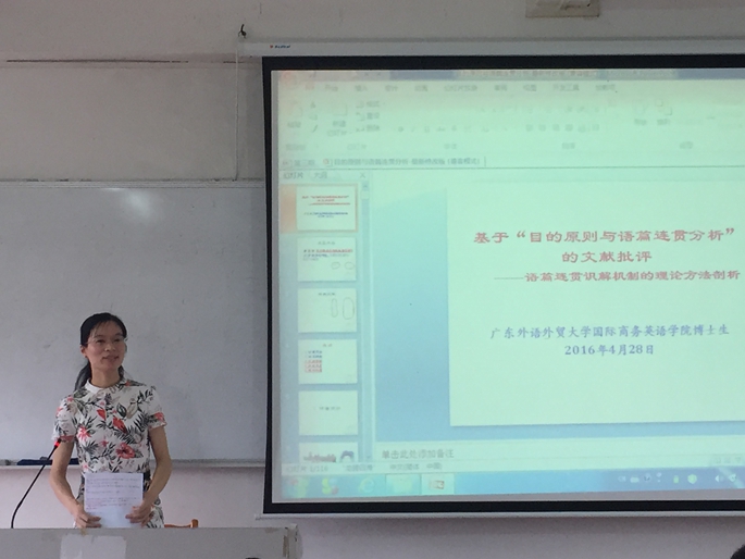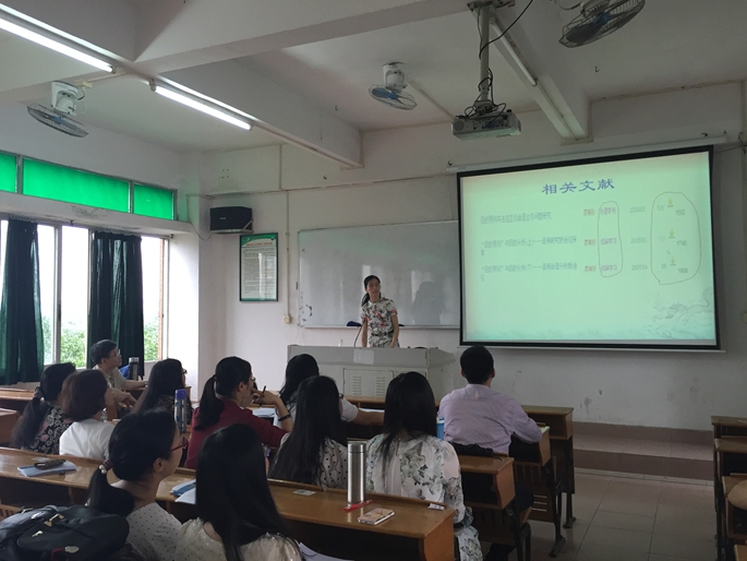 赵耀老师选取了外语类核心期刊《外语教学与研究》上的一篇论文“目的原则与语篇连贯分析”,从文章的结构出发,分析了论文的主要思路,对其中的亮点和主要问题进行了详细的评析,并根据论文的不足之处提出了新的理论建构方法和论文写作的思路。赵博士清晰的批判性分析步骤,丰富的专业知识,展示了她深厚的文献阅读功力,开阔了教师们的眼界和思路,在讲座过程中在座的教师与赵老师进行积极互动和热烈讨论,在活动最后,我系曾利沙教授对文章和赵老师的分析进行了点评。