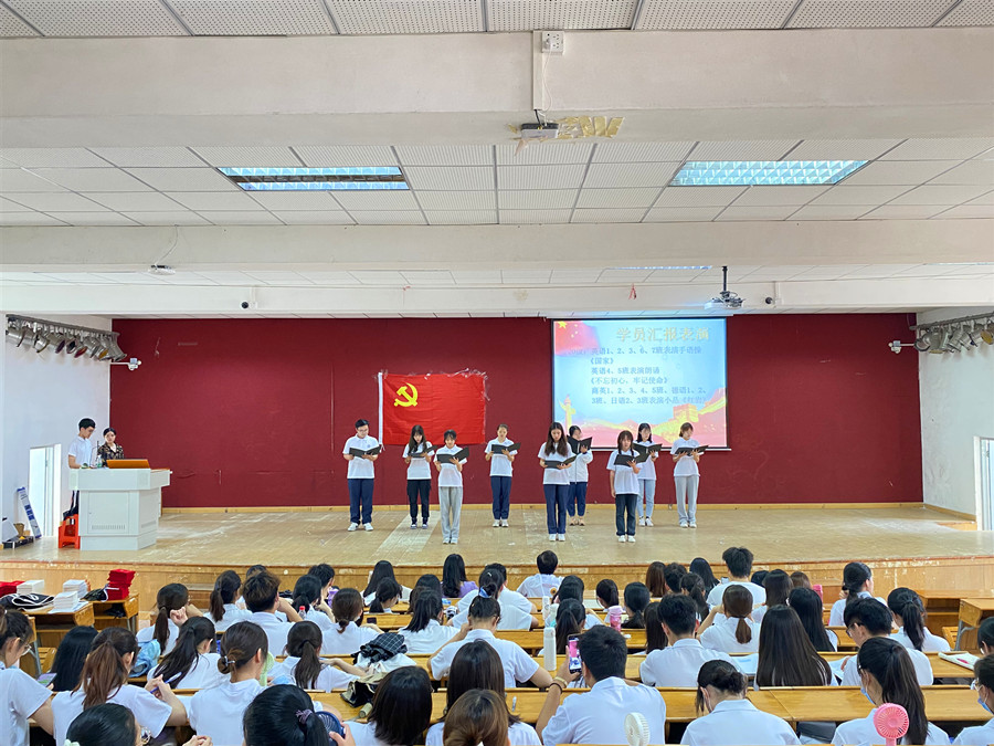 随后,各年级结业学员依次进行汇报表演。通过一个多月的党课学习与社会实践,学员们纷纷用热情饱满的结业表演向嘉宾们展示他们的学习成果。18级学员带来的朗诵作品《百年征程》,学员们激昂的朗诵把现场观众的思绪一同带回了百年间共产党人浴血奋斗的场面,让人久久不能平静。19级学员带来歌曲串烧《没有共产党就没有新中国》,20级学员表演了手语操《国家》、朗诵作品《不忘初心,牢记使命》、话剧《红岩》。尤其是话剧《红岩》用了新颖的话剧形式,收获了现场的阵阵掌声。这些结业作品纷纷表达了他们对国家的热爱,也体现了党史学习教育在青年学生中收到了良好的效果,学党史,强信念,跟党走,青年学生正在用自己的实际行动践行着自己作为一名合格的社会主义建设者和接班人的初心和使命。