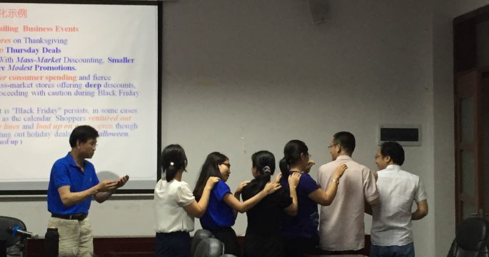 曾教授首先介绍了商务英语教材的使用现状,并以beat365官网beat365平台官方网站商务英语专业正在使用的《商务英语综合教程》为例,分析了本套教材的编写思路和特色,同时客观地指出其在编写理念,知识导向,选材,内容篇幅,教学设计等方面的不足之处。其次,曾教授带领大家探讨了商务英语教材体例设计的创新问题。他指出课文单元教学设计应模块化与系统集成化,例如知识模块(词汇学知识、修辞学知识、语篇语言学知识、语义学知识、文化知识等),导入模块 (主题拓展、关联信息拓展、内容拓展),课文教学重点与难点 (问题突显化、解决方法突显化),宏观结构建构与微观词句解析的统一(树木与林的关系)。同时,曾教授指出商务英语教材内容选材原则应遵循实用化、需求化、主题化、知识化、模块化,并结合商务英语教学内容一一举例进行详细阐释,还跟老师们分享了他自己搜集的几十篇商务英语选材文章,供大家学习和参考。