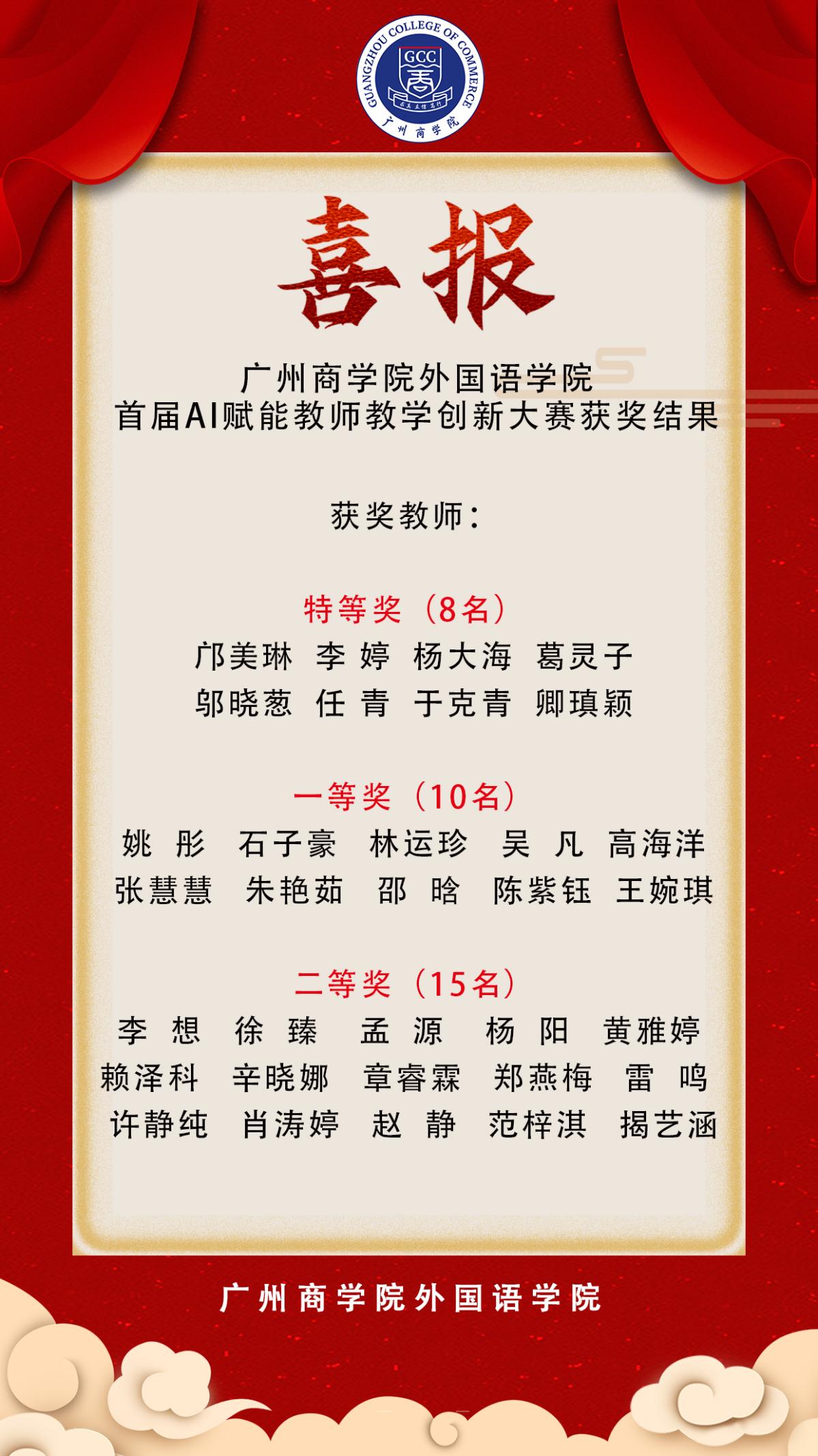 经过多环节的激烈比拼,大赛最终评选出特等奖8名,一等奖10名,二等奖15名,其中获得特等奖的8位老师,将代表beat365平台官方网站参加beat365平台官方网站首届AI赋能教师教学创新设计大赛。